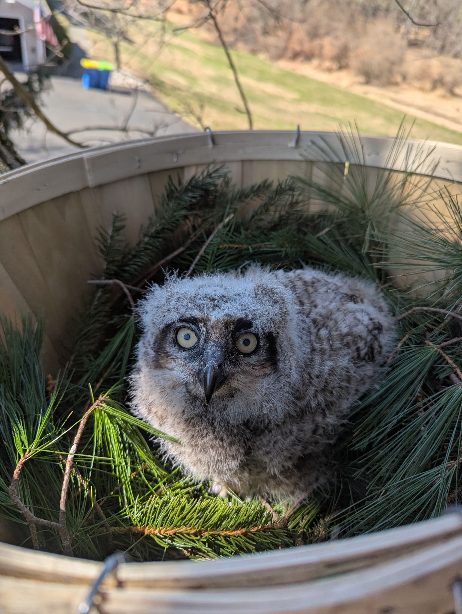 The Raptor Trust, in Millington, announced the successful reintegration of a horned owl nestling with its family this week, about two weeks after the young owl fell out of its nest. (The Raptor Trust via Facebook)