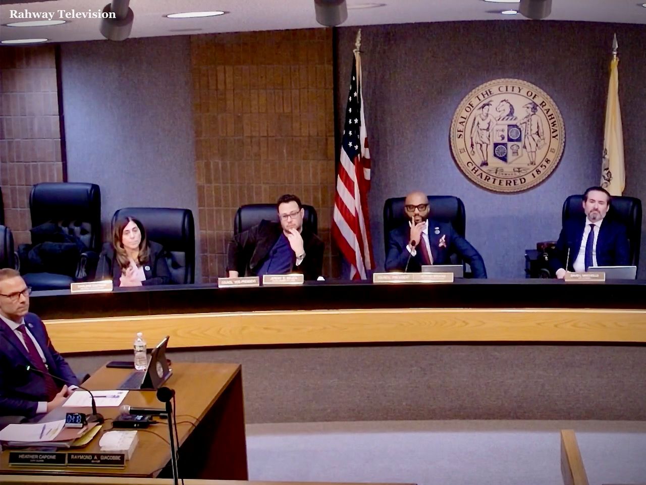 Rahway City Council members and Mayor Raymond Giacobbe during the March 3, 2026, council meeting, where officials voted to cancel the bid process for the city’s water utility. (Rahway Television via YouTube)