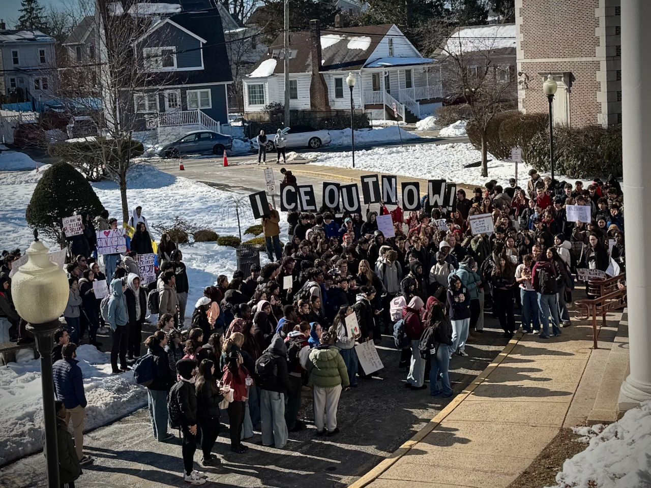 More than 150 Highland Park High School students participated in a walkout protesting immigration enforcement before some marched off campus and down Main Street.